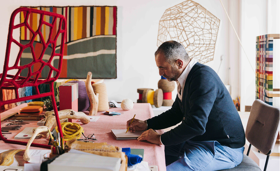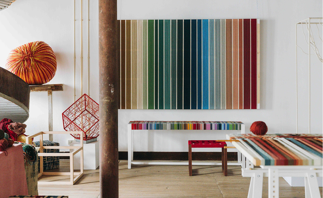 A cor é uma das imagens de marca do meu trabalho. No que toca ao Arraiolos, às vezes até estão habituados a cores mais sóbrias, cores mais pastéis. Mas eu agarrei na lã de Arraiolos e fui buscar as cores um pouco mais vibrantes. E, portanto, isso tornou-se como uma marca de reconhecimento. Seja pela escolha da matéria, seja pela escolha das cores, das composições que crio, isso são dois traços significativos identitários da minha marca. E depois, obviamente, que a cor é uma linguagem universal, é algo que chega a toda a gente. Ninguém fica indiferente à cor. Sejas mais ousado ou mais contido, há sempre cor. A cor faz parte da nossa vida. A nossa percepção da cor é muda, obviamente, e é diferente de pessoa para pessoa, mas é uma linguagem que chega a toda a gente, e que nos transforma os dias. Não vivemos a preto e branco.
